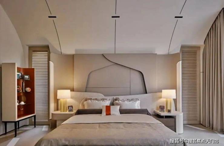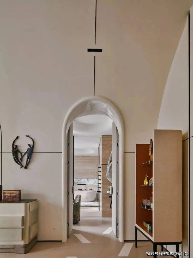 顶层专属于主卧,推开双开门,拱形天花设计尽显浪漫,挑高至3.8米,一条长灯带自浴室贯穿至整个卧房,分置于灯带两侧的弧形结构,环抱出一份安心。而其床头背板也被设计成拥抱的视效,为空间增添温暖包裹的氛围。