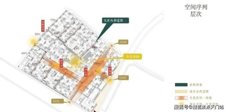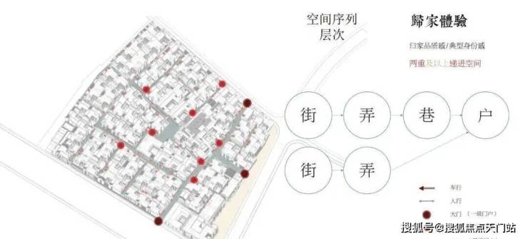 士林润园社区规划可分为蓬莱路城市公共景观以及社区内部景观两个部分,其中市政绿地衔接于上海2035城市总体规划中“蓝绿丝带”的上位条件要求,社区内部街巷空间形成空间序列形成递进的层次,将归家体验的序列依次展开,形成城市街道→入口(一级门户)→街巷→节点空间→里弄门(二级门户)→合院入户(三级门户)的方式,基本可保证大多数住户可体验到两重以上的空间递进。