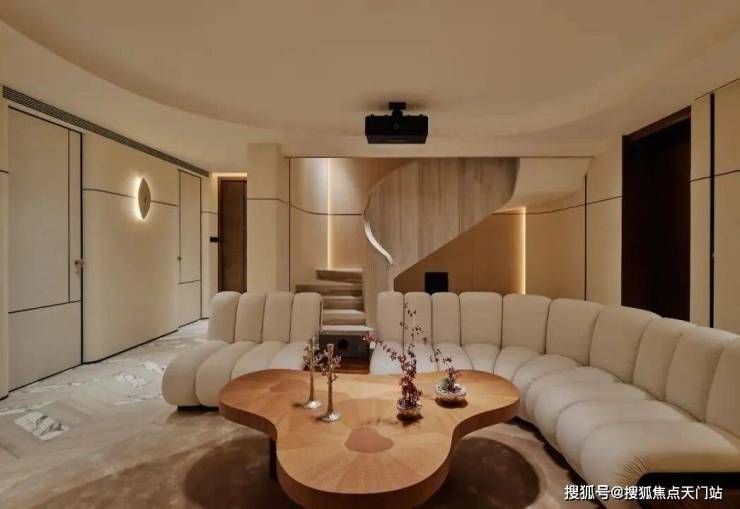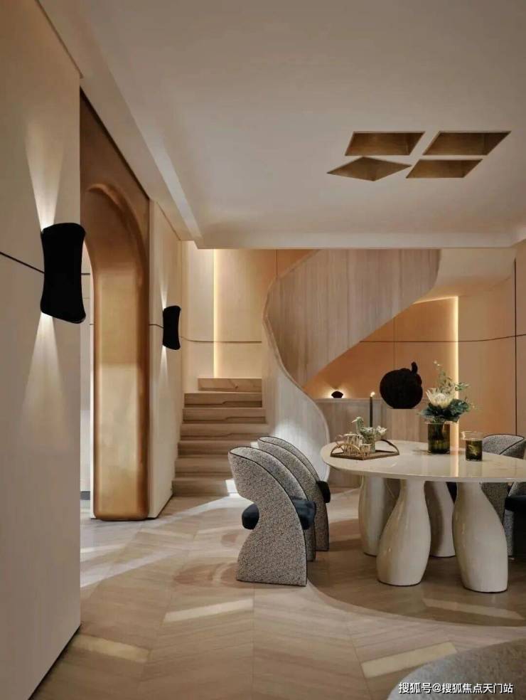 顺着弧形木质楼梯抵达地下空间,仿佛游走在一曲流动的乐章中。一切都共同呼应着水的特质,传递着低调隐逸情怀与圆融个性。