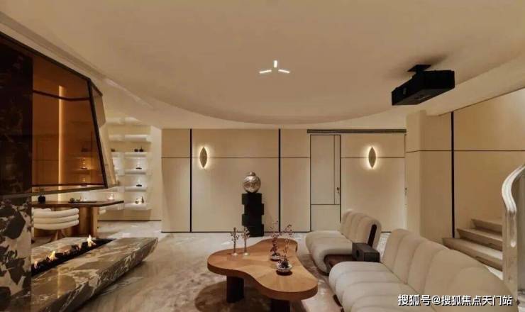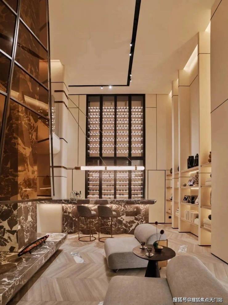 这一层更聚焦于私谈、影音、娱乐、品酒、饮茶,深沉又静谧。近6米高的垂直挑空玻璃壁炉矗立于眼前,如同一件令人赞叹不已的大型雕塑装置,它弱化了空间中的大理石承重柱,将其纳入共同构成一个完整的全新的装置,集功能性与艺术性于一身。