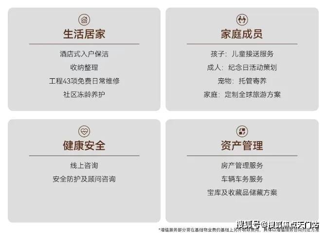 同时引入源自世界奢华酒店的 “无边际服务” ,依据280余项标准化服务细则,提供日常居家服务、健康安全、资产托管等增值服务,如入户保洁、儿童校车点接送、宠物托管、工程43项免费日常维修等,打造“冻龄”社区。