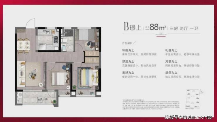 建筑面积约88m²户型是“明星”户型,一期首开即售罄。二期88m²户型房源占比60%,整个户型格局十分方正,通透感强,每个房间的尺度都恰到好处,非常适合刚需群体上车!