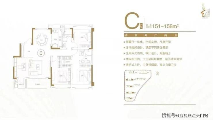 建面约151-158㎡四室两厅两卫户型特点:客餐厅一体化,空间实用,尺度开阔;多功能间设计,满足不同居住需求;全明采光布局,横厅设计,明厨明卫;南向四开间,主生活区域朝南,阳光清风常伴;套房式主卧,主卧带飘窗,独立衣帽卫。