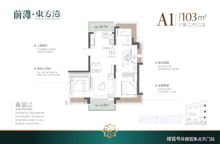 户型建筑层高3.1-3.15米,无连廊,双阳台配置。其中建面约103平户型2梯2户,其余一梯一户。