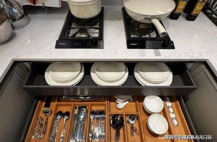 为使厨房成为「真正幸福之地」,璞元在各个细微之处倾注关怀,从地柜拉篮系统,到上柜系统,再到抽屉分格系统,浅抽与深抽搭配,让整个厨房空间,既百变,又充满秩序。