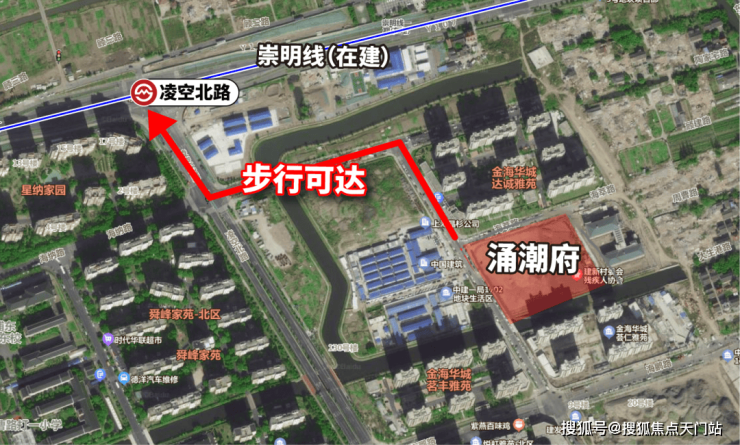 项目距离崇明线(在建)直线约600米,这个距离恰到好处,既不会受到轨交噪音的直接影响,也能做到步行可达。