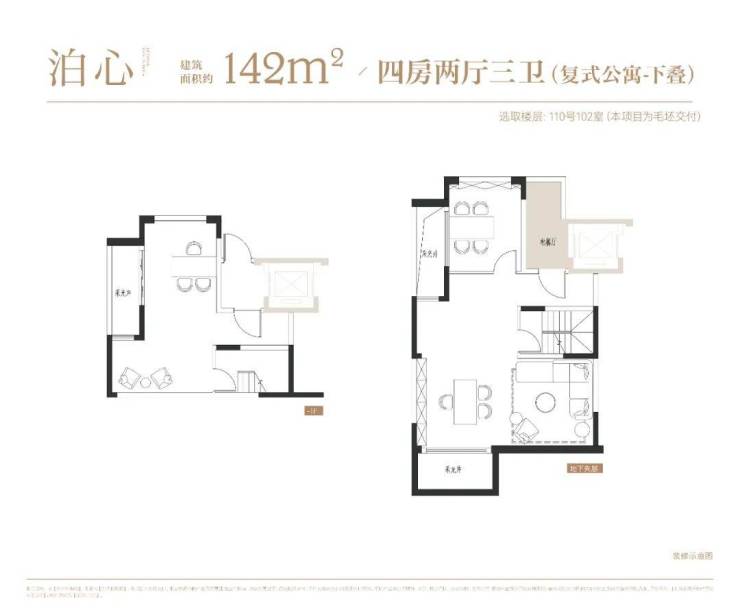下叠户型4房2厅3卫,一层会客区,二层居住区,附带地下空间,可以根据主人喜好,定制成如健身房、酒窖、影音室、台球房等,任凭想象。
