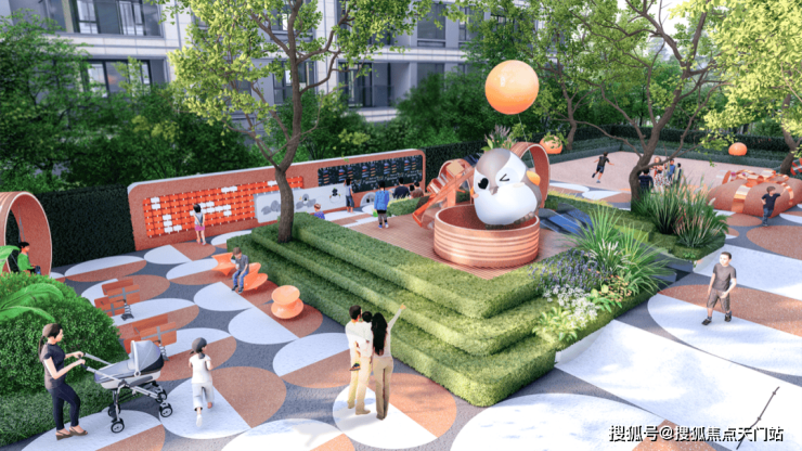 以公园+花园的双园社区、品质归家入口、特色阳光草坪、双会客系统、主题儿童乐园、健身系统这六大功能价值为主,并且融合由三条不同主题的林荫步道和三个圆形景观节点组成的“绿林项链”全区漫步系统,共同构成全区“6+1”森O₂家园系统。