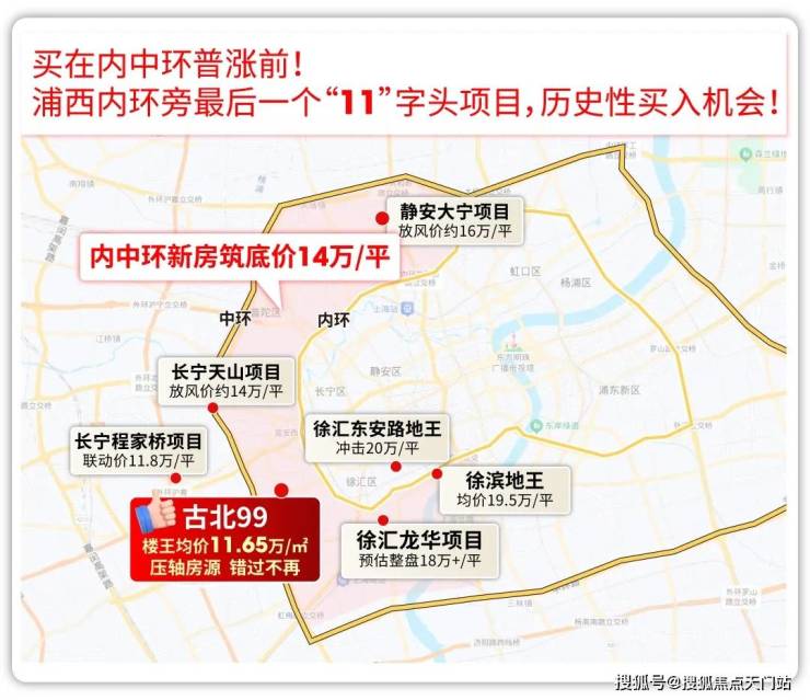 值得一提,相比紧挨中环的长宁天山项目、贴着外环的程家桥项目,古北99距离内环步行仅约1.4公里,却有着更亲民的价格。