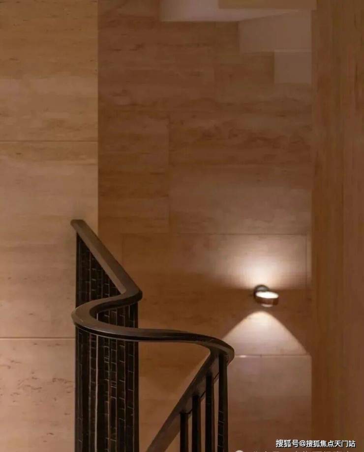 深铜色的栏杆和扶手融合传统与现代语汇,演变出一种当代型态,与现代白色洞石相映成趣,营造出优雅纯粹的意境。