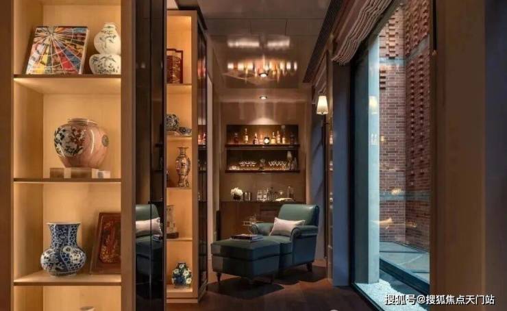 在对角,我们开辟了一面落地窗展示酒窖,展现主人的收藏。温暖的酒窖灯光和壁炉光线映照在白橡木酒架上,为客厅带来温暖舒适的氛围。