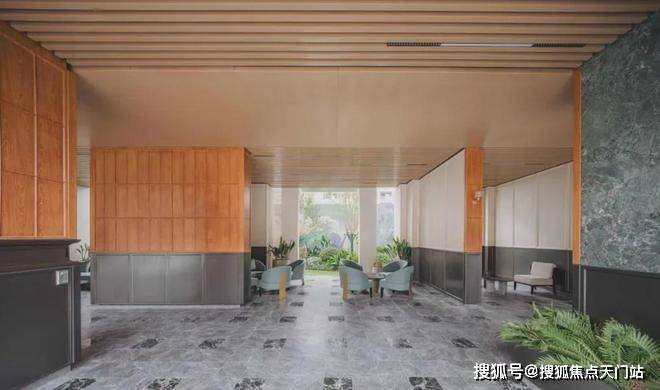 同时,社区内部景观打造了大面积的叠级水景,搭配普拉达绿大理石和浪淘沙石材,呈现整体空间的隐奢基调。