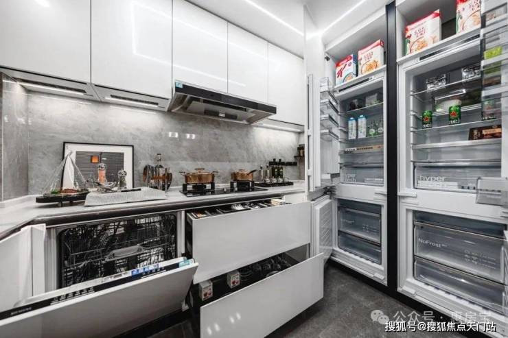 入户后,所有玄关柜均为交付标准,还精心配置了“除臭精灵”,下方更预留了扫地机器人的空间,为日常起居提供便利;像传统的豪宅三大件,项目采用大金品牌中央空调地暖两联供,以及格兰斯柯的新风。厨房空间,甄选西门子新款的抽油烟机、灶具、洗碗机等,甚至连大部分项目不配备的冰箱也是交付标准;还特别配置了轨道插座、前端净水器和凉霸;吊轨金属玻璃移门,既美观又方便清理。