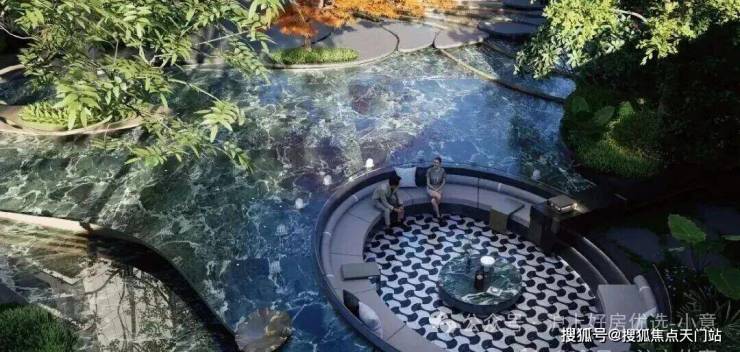 走近细看,水景底部铺设了蓝钻瓷片,夏日炎炎的时候这样的水景还能做到水波习习,给人视觉体感上就降低了五度。