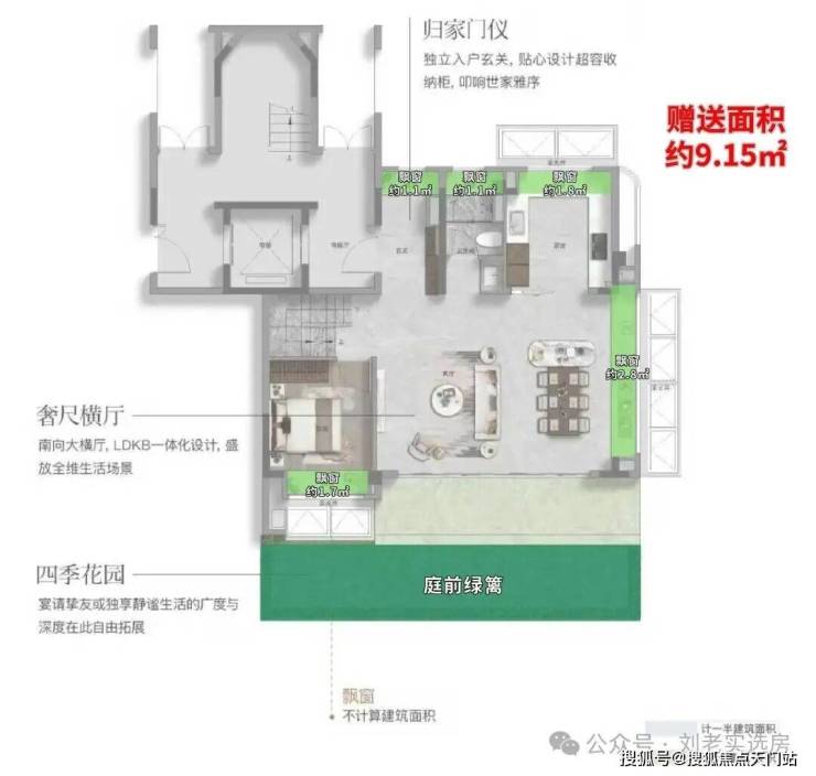 第一,这个户型有约9.8㎡的飘窗,约7.2㎡的阳台,整体的附赠高达约13.4㎡。 这是目前上海外环沿线,是附赠率最高的一个小高层产品。