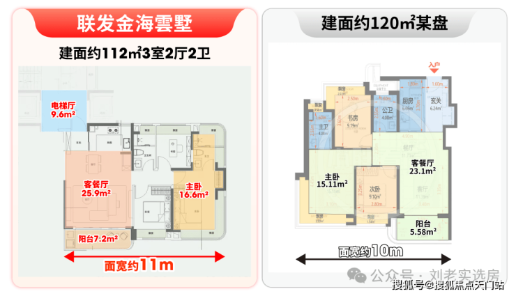 说实话,竞品的建面约120㎡也同样非常出众。但即使如此,金海雲墅建面约112㎡的产品依旧在附赠、客厅、主卧、独立电梯厅等维度碾压了他。