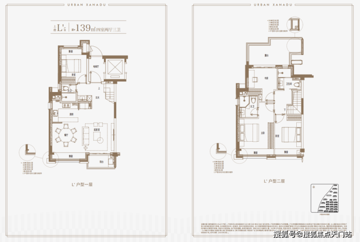 建面约139㎡上叠户型,三层是会客区,四层是居住区,阳台+露台+多个飘窗设计,附加空间非常大,在别墅类产品中实属罕见!