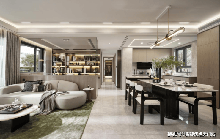 问题。厨房、餐厅、客厅三大空间联通,不仅通透感十足,还构建了一个利用率超高的家庭核心区,在这样高度开放的空间里,即使互不交流,也能保持交流和关注!