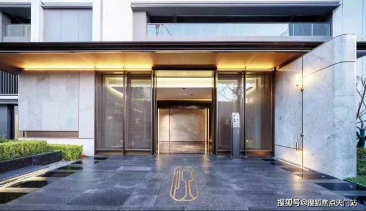:单元门头整体和小区入口大堂呼应,两侧采用大象灰石材哑光面和拉槽面,搭配定制龙鳞纹金属网,带给业主的出入间的仕第门庭礼序,呈现了现代东方的城市风骨,尊贵感油然而生。