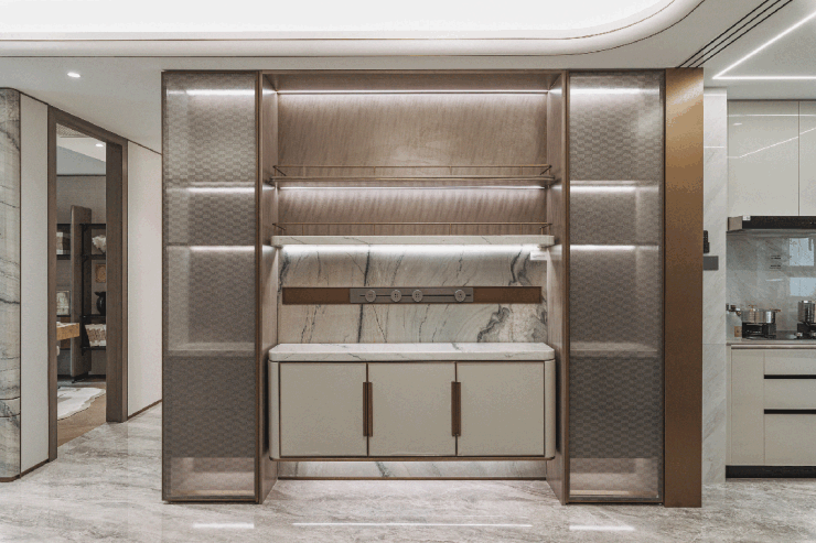 地下归家大堂用材选取 意大利进口岩板,色泽温润,和谐统一。 人脸识别自动移门便捷实用, 金属夹丝玻璃美观大气,开阖家的尊崇与安心。