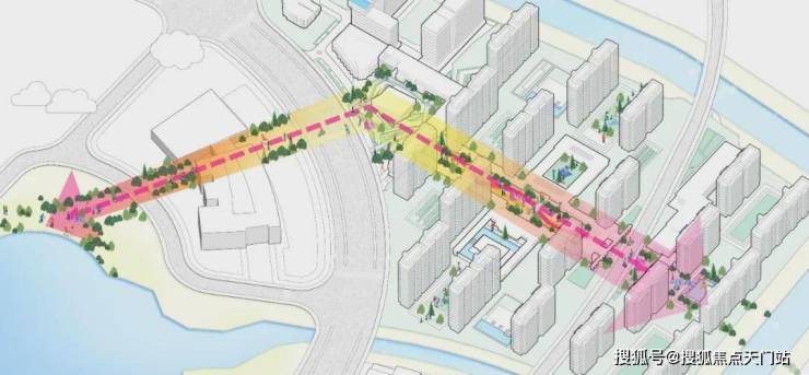 开放共享轴链接各个节点:生态运动休闲带,生态林荫大道,街区绿地;形成连续的绿色公共、半公共空间。并在绿地中注入国际文化特点的商业配套,形成尺度宜人的街道和建筑尺度。