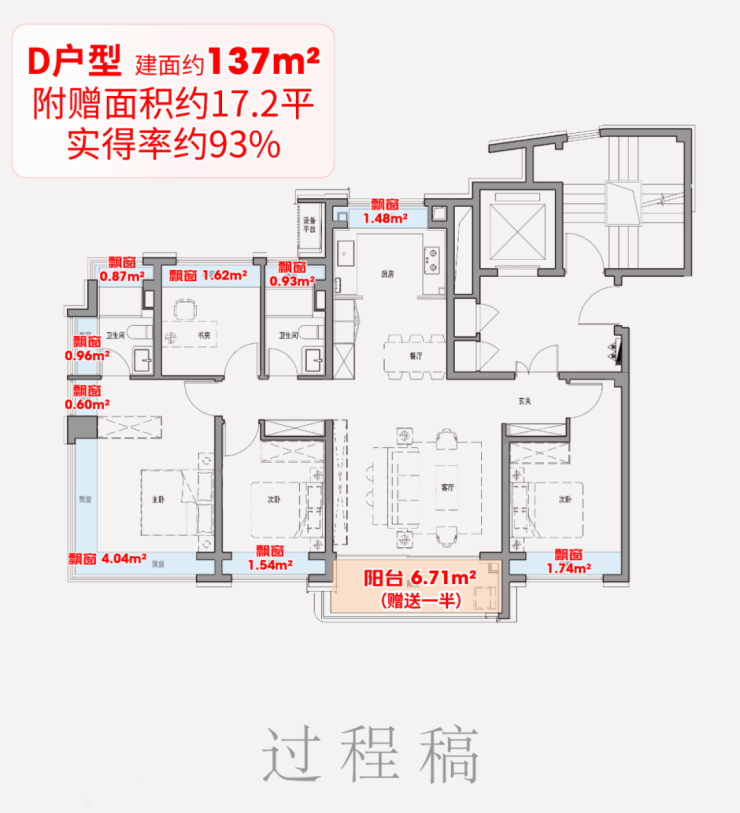 D户型7飘窗,总赠送面积约17.2平,实得率约93%;