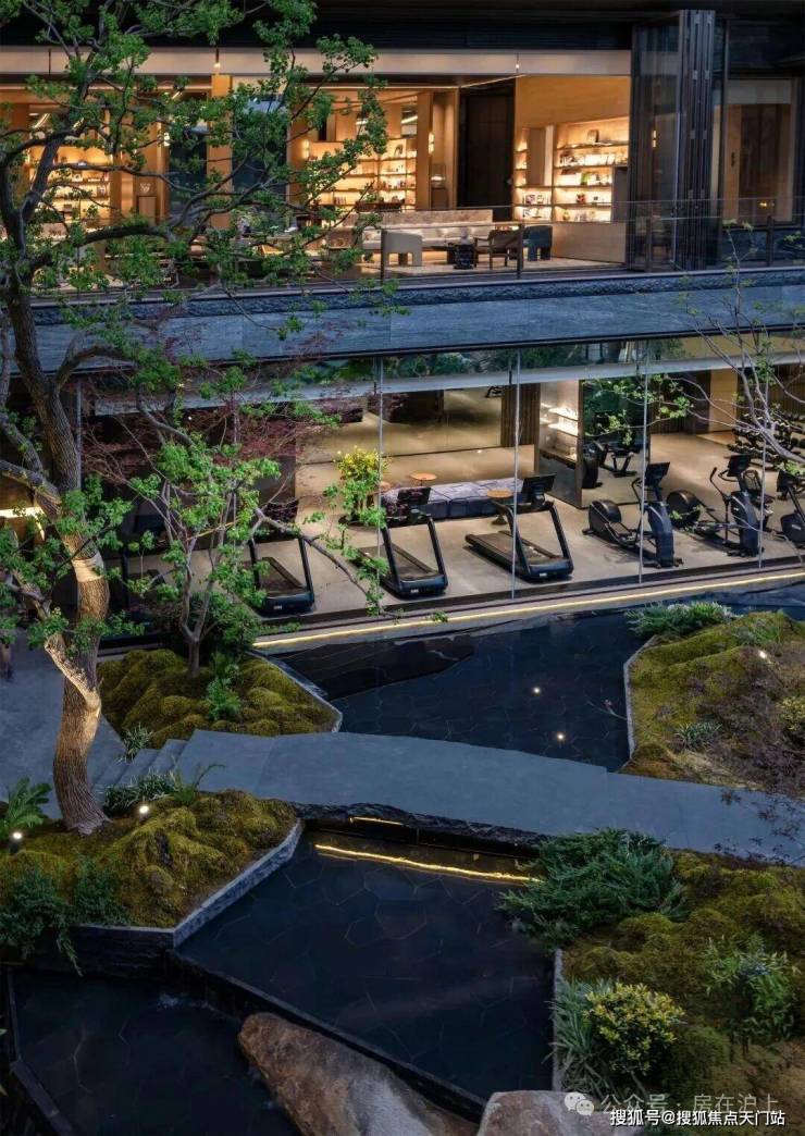 地下区域的健身房直面庭院景观,每台跑步机都正对玻璃中轴,满足"强迫症"用户的极致体验;