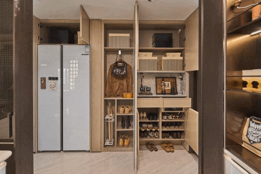 2.创新S墙分户设计,让收纳系统从平面延展为立体暗线,通过玄关柜、冰箱柜、零食拉篮的巧思,用立体空间创造更海量收纳!