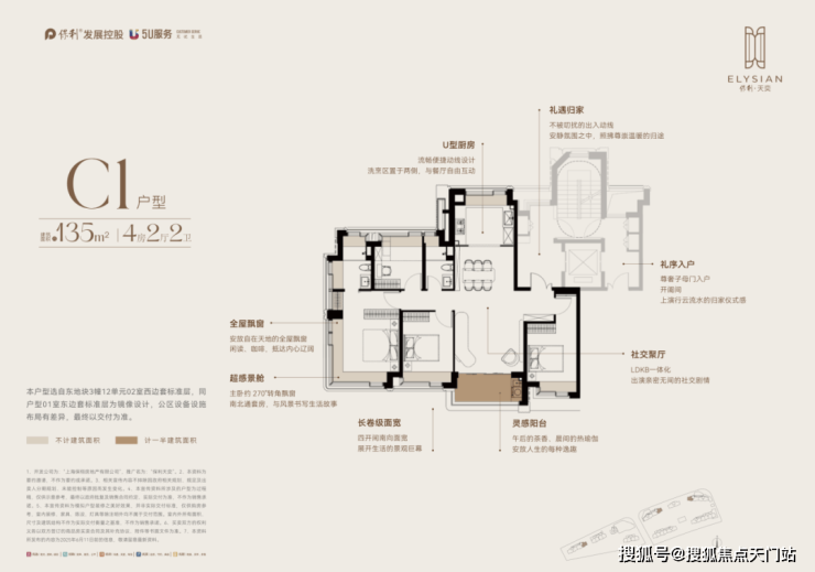 3.这个户型同样采用 U型厨房,升级的点在于 客厅可以容纳大圆桌,餐边柜也升级了 酒店式mini bar的设计,提供酒柜、餐具等大容量收纳空间,同时也能放下咖啡机等小家电,一日三餐之外,延展出品酒、下午茶、咖啡吧等更多生活场景。