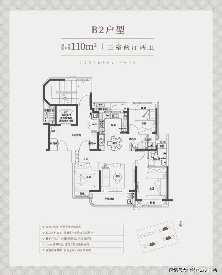 建面约110㎡中间套(B2户型),也同样做到了南北通透,三开间朝南,洄游动线,布局合理,无论是空间尺度还是通风采光,与边套享受一样的品质感!