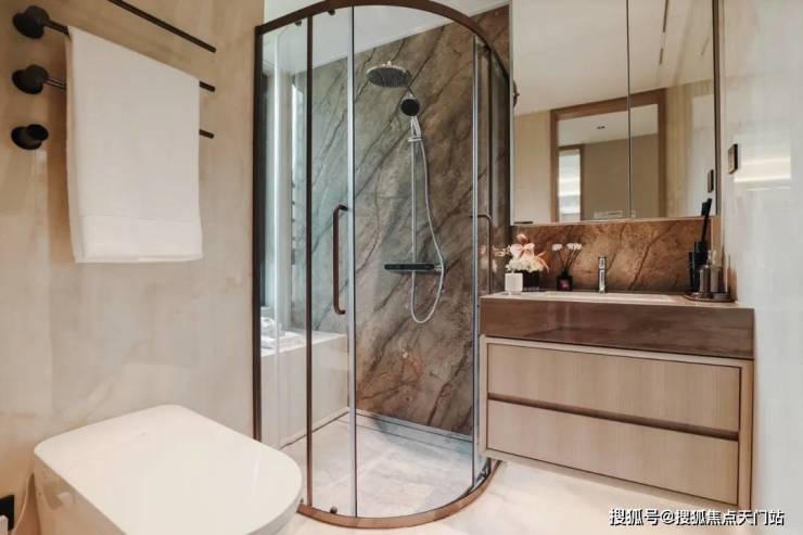 同时卫生间配有杜拉维特的面盆、汉斯格雅的龙头+五金、AO史密斯燃气热水器、杜拉维特智能马桶(建面约139㎡户型)、恩仕智能马桶(建面约110㎡户型)等国际一线大牌,这个标准放到南大甚至是整个中环沿线,都是顶配级别。