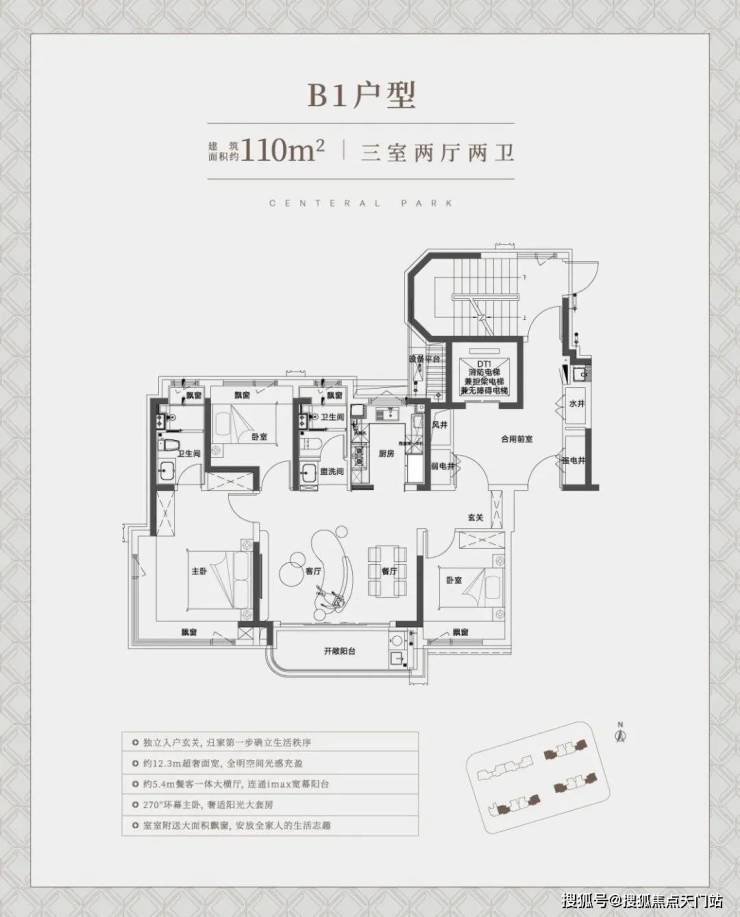 建面约110㎡边套(B1户型),1个宽面阳台、5个飘窗,整体南向面宽做到了约12.3米,大横厅面宽约5.4米,带来超大空间体验和充足通风采光。