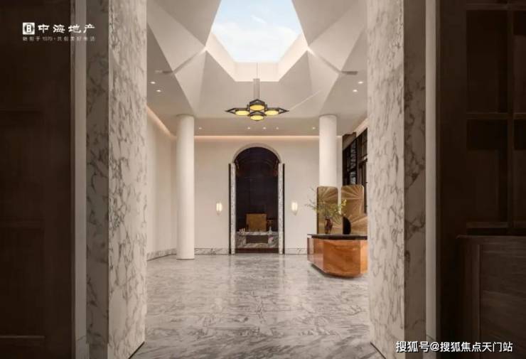 进入大堂,抬眼可见的是由一块完整的 巨型玻璃 组成的天窗,约7.9米高的钻石切面整玻吊顶+约500余块大花白奢石铺就的地面,让人每一次走进来都能感受到自然光线的包围,仪式感十足!