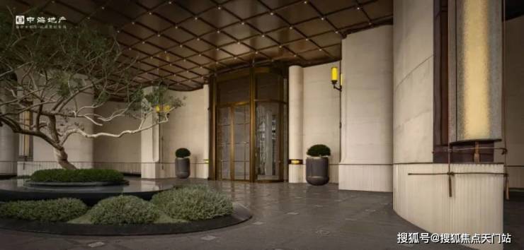 近距离看,项目的入口细节之处又不失奢华,尤其是大量 名贵石材 (安哥拉黑石材)的运用绝对是大手笔,椭圆形水池搭配波光粼粼的水景,这里还种植了一株约 7米高的铁冬青, 宛如翡翠屏风,豪门大院的气质扑面而来。