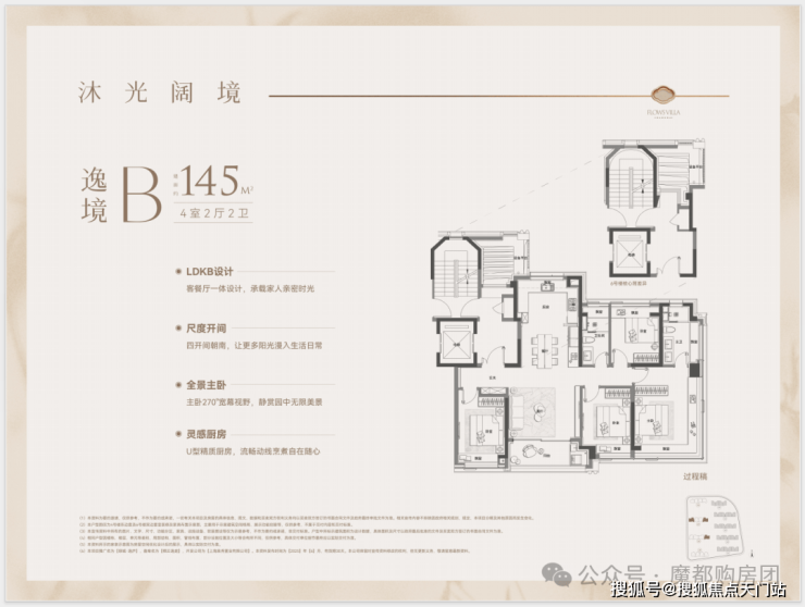 1、建面约145平户型热销且紧缺四房产品,类一梯一户设计,边套转角窗搭配超高窗墙比,采光通透,兼具功能与尺度的双重要求;