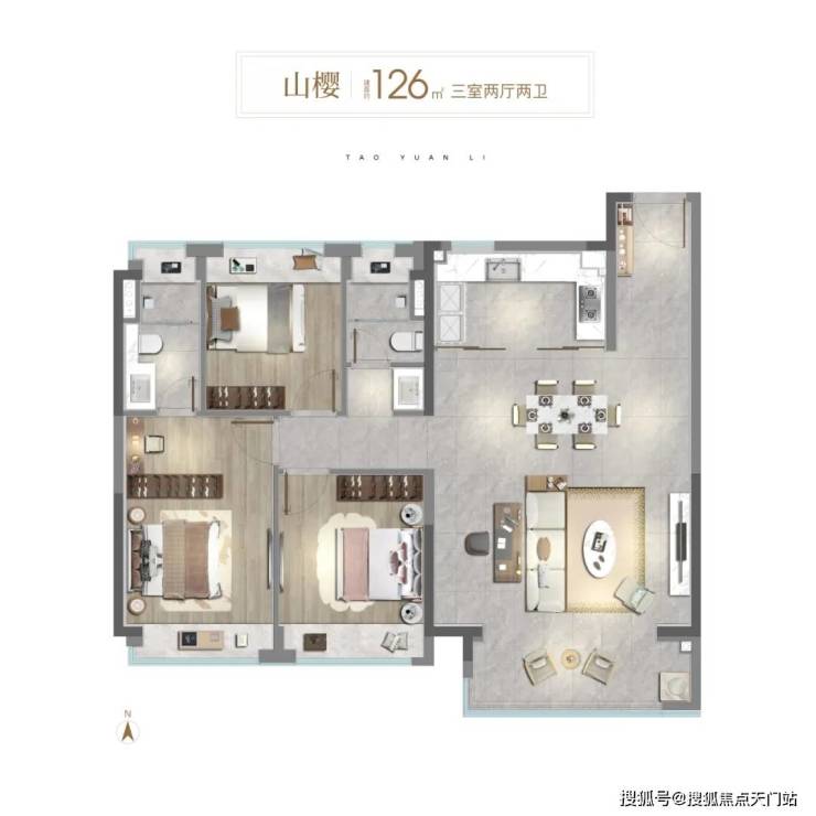 通过新桃源会客厅社区广场与独立社区会客大堂、林荫归家步道、中央景观聚场、品质入户单元昭示性景墙+专属入户铺装、首层精装大堂五大节点,赋予归家路途更多逸趣与美好。