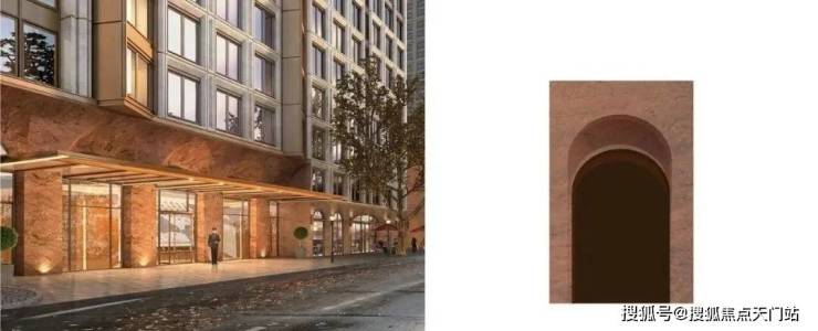 建筑基座萃取和平饭店、 洛克·外滩源等经典建筑肌理,打造连续罗马券造型。既保留开阔门楣的恢弘尺度,又消解古典建筑的厚重感,让建筑底座与体身迸发磅礴的美学张力。