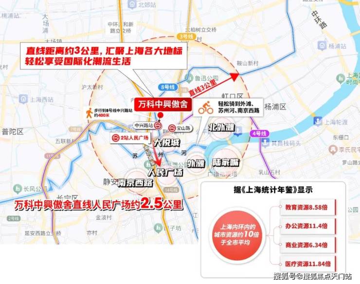 离传统市中心越近,资源密度越浓。中興傲舍离8号线中兴路站步行只有约400米,2站人民广场(直线距离约2.5公里),直线距离约3公里覆盖南京西路、静安寺、南京东路、陆家嘴等核心板块,中興傲舍与市中心资源深度绑定。