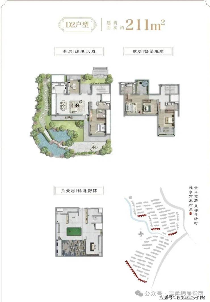 从户型设计上看: 建面约138-188㎡联排与建面约211-214㎡院墅产品,庭前绿地,大面宽,地上仅2层,真正的低密宽境别墅,产品力断层式领先。