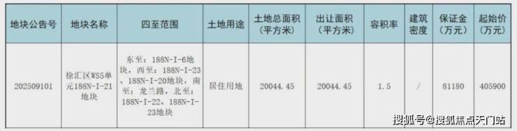 公告显示,徐汇滨江新地块出让面积20044.45㎡,起始价约40.59亿元,折合起拍楼板价约13.5万/㎡!