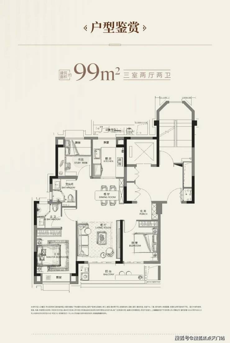 建面约99㎡经典飞机户型设计,南北通透,作息空间互不干扰; 集约化过道+多飘窗设计,视觉向外延展性更大,整体户型开阔感更强; 独立玄关+双卫配置,保证了业主足够的私密性和舒适度; 南向次卧与阳台相连,使得室内尺度、采光及通透性都十分出彩。