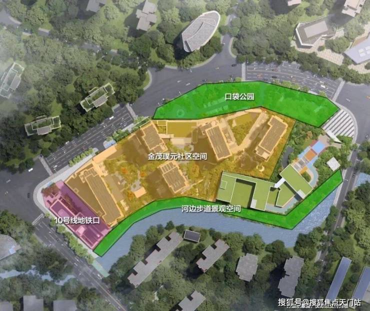 因为这个地块的四周有河道,有地铁,有商业。在金茂的设计里, 这个底盘周围的一些配套都是和社区相连,被精心打磨过的。