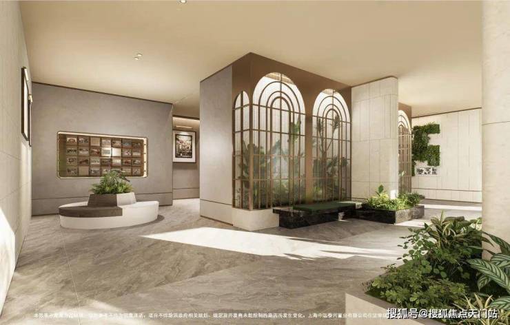 另外部分楼栋架空层还设计打造了丰富 社交功能空间, 米色大理石背景墙体现高级质感,镂空屏风透出社区景观的绿意盎然。