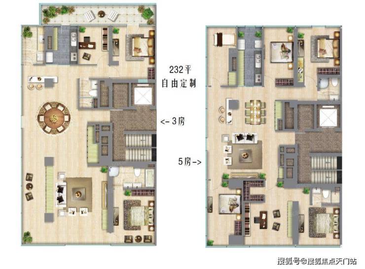 以232㎡面积产品为例,既可以做成3房也可以做成5房,