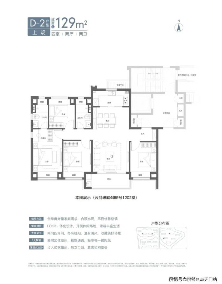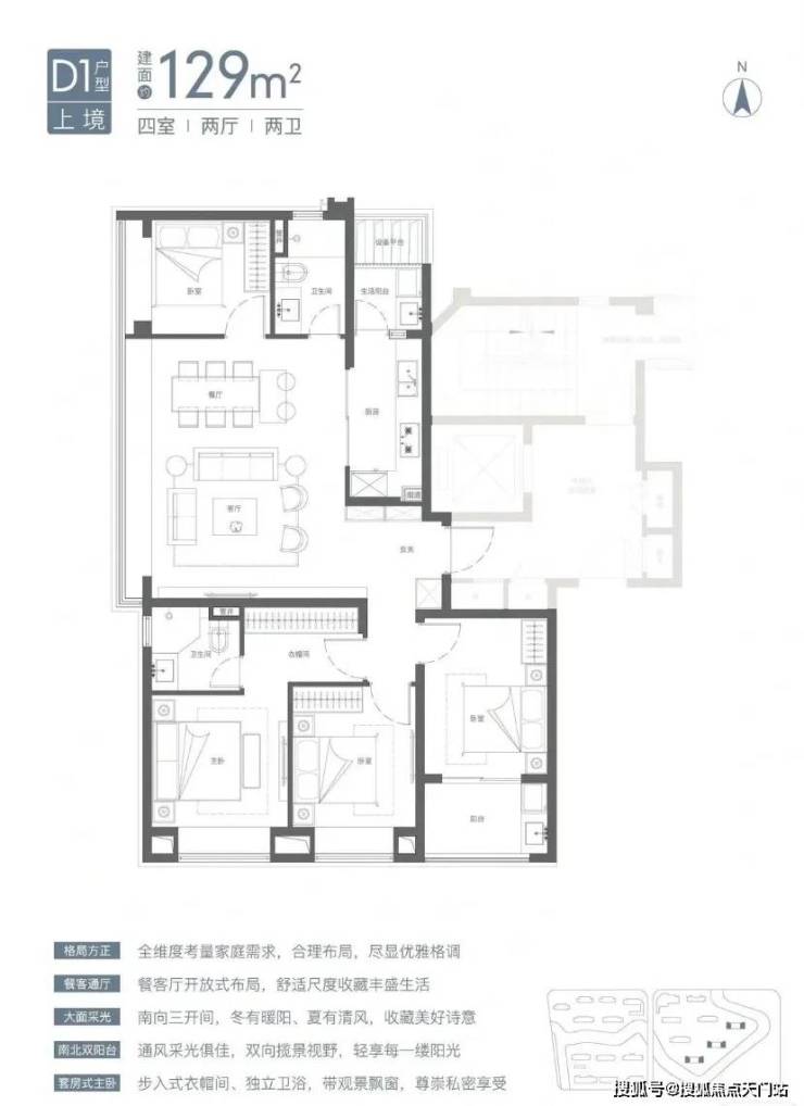 预算充足的小伙伴,可以选 建面约129㎡4房,经典的三卧朝南、边套观景户型。