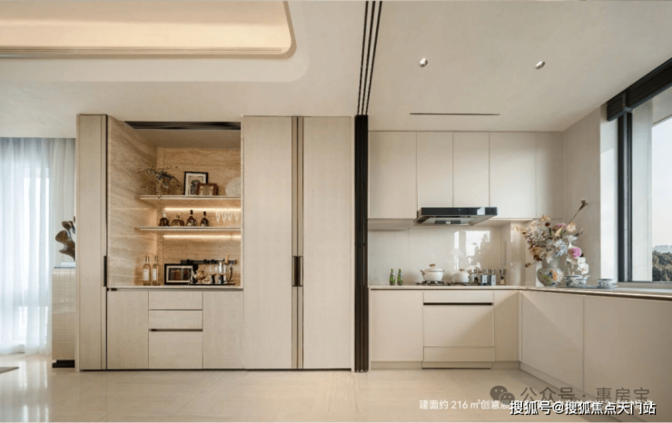 厨房与餐厅采用开放式布局,U型台面让洗-切-炒动线形成闭环,洗菜区、备餐区、烹饪区呈三边分布,形成高效洄游路径。