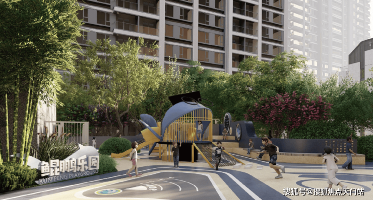 以 “鲲鹏乐园”主题儿童乐园、鲲鹏书院、老人颐乐空间、多元艺术花园、约760m“汽车文化”主题跑道、森林漫步道等共享场域为居者构筑一个有温度的社区。