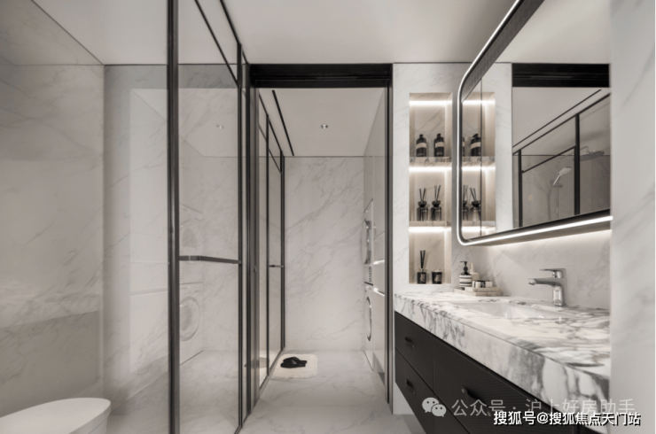 颜值 MVP :四分离卫浴设计,实现独立洗漱台、卫生间、淋浴间、洗衣区互不打扰,晨起高峰也能从容有序。家政空间藏于其中,解放了阳台,让其更多承载尺度观景功能。