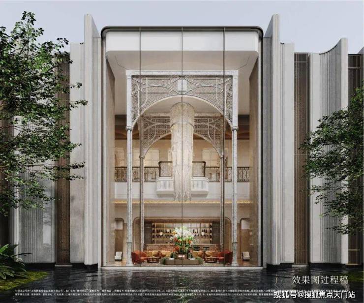 在建筑表达上,深度萃取巴黎白马庄园(Cheval Blanc Paris)核心美学,同时融合上海花园饭店、和平饭店、张园石库门等东方海派建筑元素,以“仪式感、纯粹性、细节感”为核心,打造兼具国际风范与海派底蕴的建筑格调仪式感上,对称式布局搭配精致雕花纹饰,入户动线仪式感拉满;