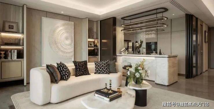 客厅背景墙的“烟雨江南”天然大理石,不同于传统平面背景墙,通过弧度及立体的造型处理,并镶嵌不锈钢材质!对于金茂而言,比奢石昂贵的,是让奢石真正与空间气场融为一体!